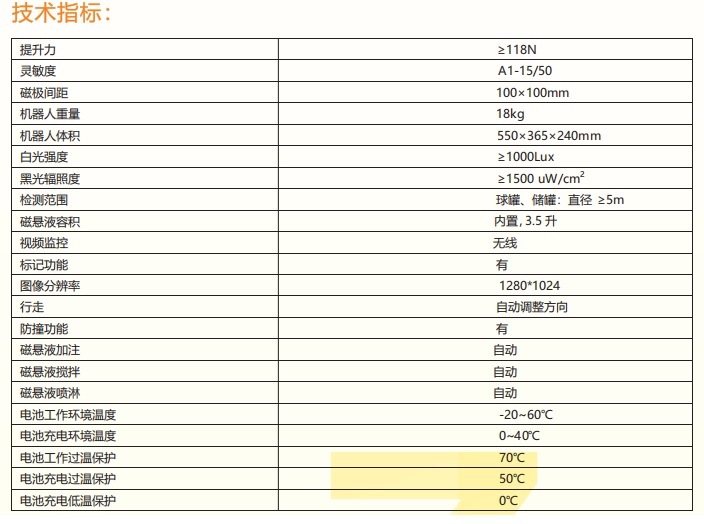 ZCM-X20-WX全自动磁粉检测系统 ZCM-X20-WX全自动磁探机器人为功能更齐全的自动磁粉检测系统,自带储、喷液装置模块,工作时无需外接其它磁粉喷洒装置,使用更方便。检测系统为我公司专利产品,由搭载有磁探机系统的爬壁机器人、监控器组成。 系统由内部可充电电池供电,不需要外接任何电源即可进行探伤作业,特别适合在野外及现场等接电不方便的场合下使用。 机器人在监控器的控制下加磁、喷洒磁悬液并匀速前进,从而实现自动磁粉检测。可对容器内外壁纵向、横向、斜向、仰向、平向等各向的焊缝进行检测。 内置白光灯和黑光灯,可进行普通磁粉和荧光磁粉探伤。 机器人采用铝镁合金一体成型,结构稳固结实,防尘防水,机器人永磁吸附,失电自锁,确保使用安全。 系统与传统检测方法相比,保证检测质量,检测效率大大提高。 系统自带磁悬液储罐,自动抽液、自动搅拌、自动喷淋,使用更方便。